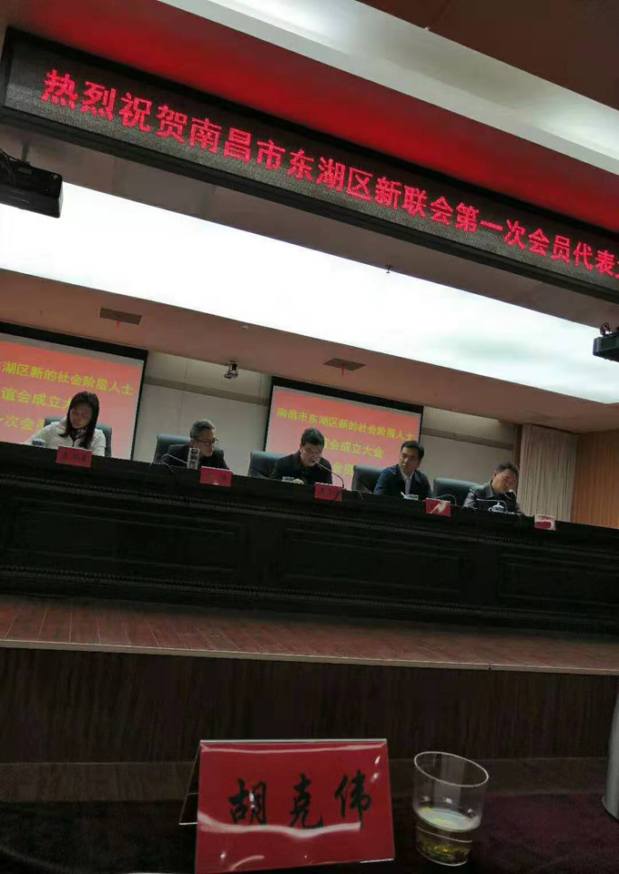 12月15日上午,南昌市东湖区新的阶层人士联谊会成立大会暨第一次会员代表大会在区文化活动中心四楼新闻发布厅举行。中共南昌市市委统战部麦建宁部长、中共东湖区委贾域超书记、区委统战部姚部长等领导及东湖区新的社会阶层人士代表等六十多人出席大会,南昌市东湖区人大代表、区工商联副主席、江西省装饰行业协会副会长胡克伟先生参加了此次会议。大会在雄壮的国歌声中拉开大幕。