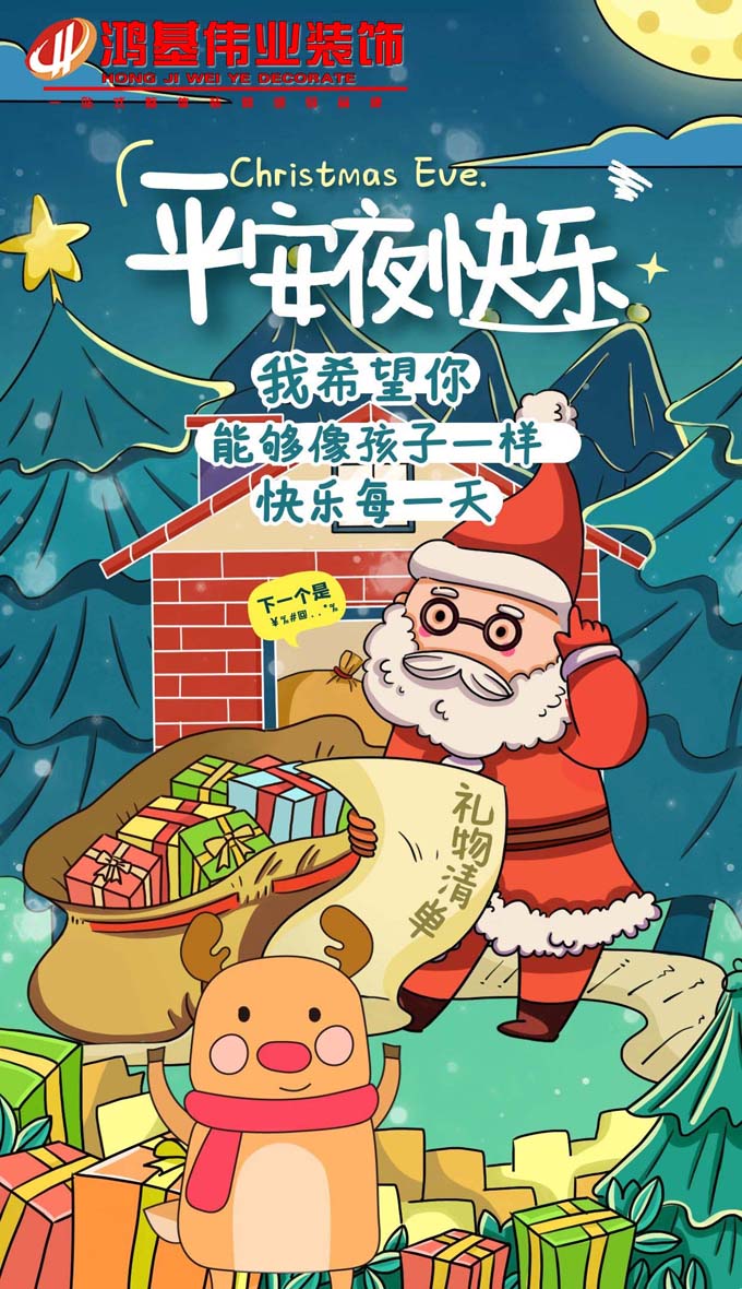 平安夜到了!南昌鸿基伟业装饰公司陪您一起过节日,再送你一份问候,祝大家平安幸福。送一串深深的祝福,分分秒秒都是平安吉利,传一份浓浓的心意,点点滴滴都是平安如意。