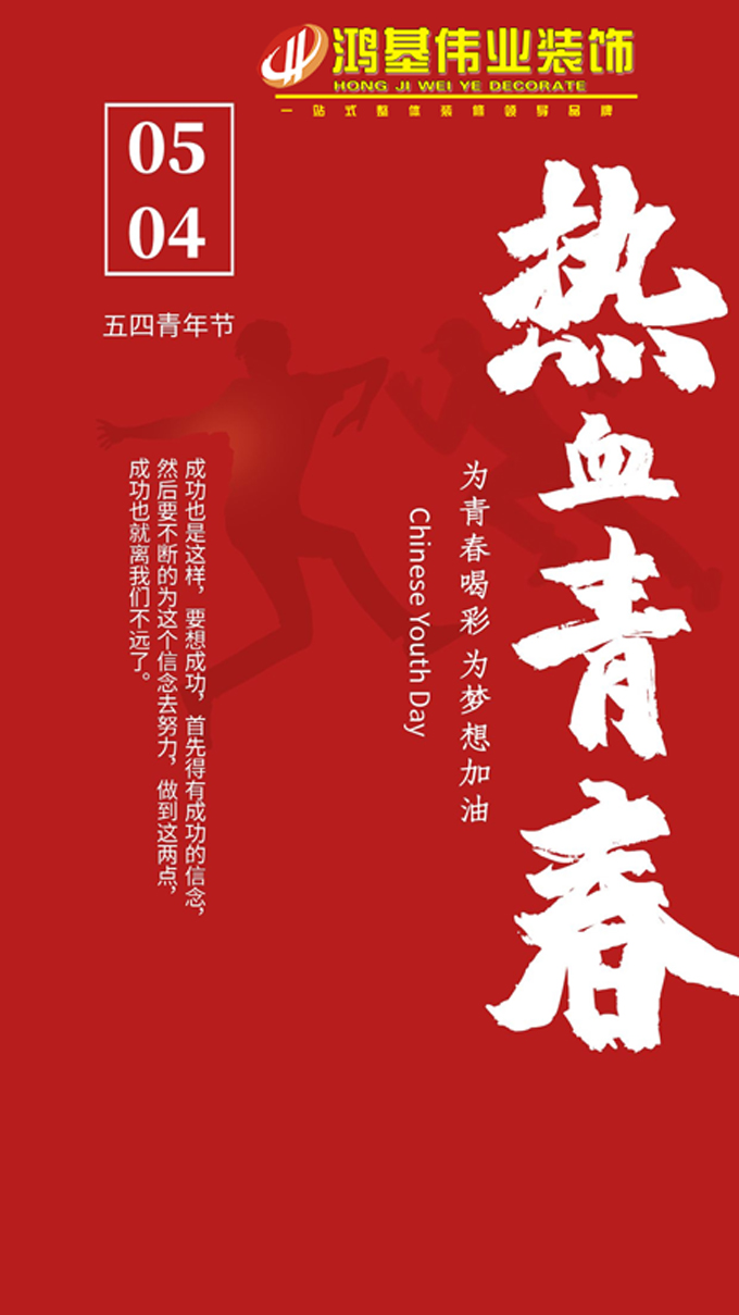 借着五四青年节,这个朝气蓬勃的时刻,鸿基伟业装饰愿您青春不朽,岁月不老!青春的脚步是激昂,青年的时光是希望,让拼搏的号角吹响,让奋斗的旗帜飞扬,让青春的岁月欢畅,让青春的生活明亮!用青春灌溉事业磨砺出彩的人生!