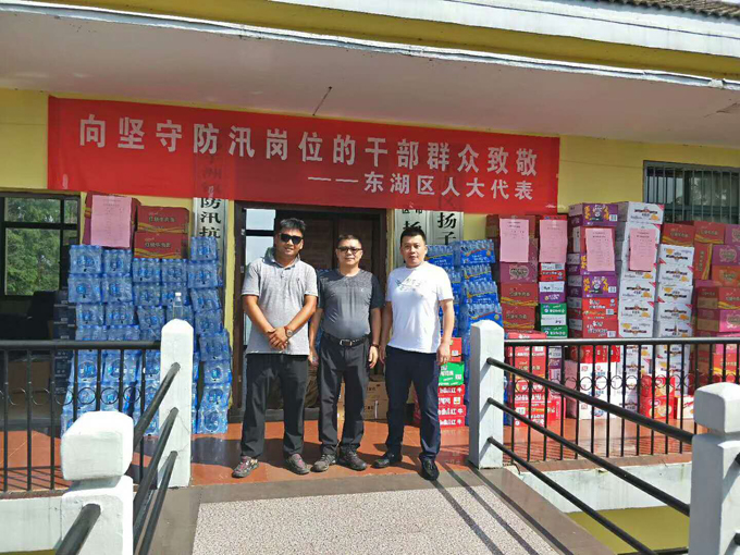 洪水无情,人有情,受近期强降雨及赣江上游水情双重影响,南昌市东湖区汛情持续发展,水位接近历史极致,局部已出现内涝灾害,危险的汛情同时牵动着人大代表的心。为保护扬子洲地区安全,全区广大干部群众冒着高温酷暑和蚊虫叮咬,24小时坚守圩堤巡查,7月13日上午,南昌市劳模、东湖区人大代表、鸿基伟业装饰公司董事长胡克伟先生面对百年一遇的汛期,继赴东湖区扬子洲防汛指挥部参加抗洪抢险,捐款捐物后,再一次奔赴现场为抗洪值守点的工作人员送去西瓜、矿泉水、方便面、饼干等慰问物品和防汛物资,为抗洪前线送去温暖和爱心,向坚守在防汛岗位的干部群众致敬。