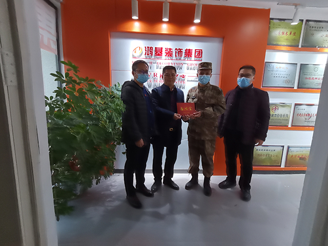 在2021年春节即将到来之际,南昌市东湖区武装部邱建新政委、区委统战部姚部长、彭家桥街道武装部徐部长等一行莅临鸿基装饰集团市中心设计公司,开展春节前走访慰问活动,为企业送来党和政府的关怀,并致以节日的问候和新春的祝福。