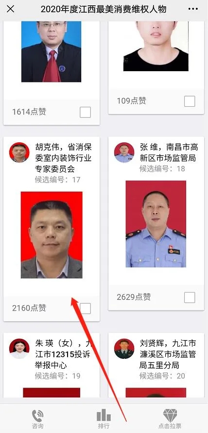 亲爱的小伙伴们 赶紧动动小手指 投上宝贵的一票吧! 投票须知 投票时间 2021年2月26日11:00至 2021年3月4日11:00 投票规则 每个微信号每天只能投一次 每人一次最多可投5票 不可对同一候选人重复投票 投票步骤 01 扫描下方二维码 关注微信公众号 “江西放心消费315” 02 点击右下角的“最美维权人物” 进入投票页面 03 为17号胡克伟投票~