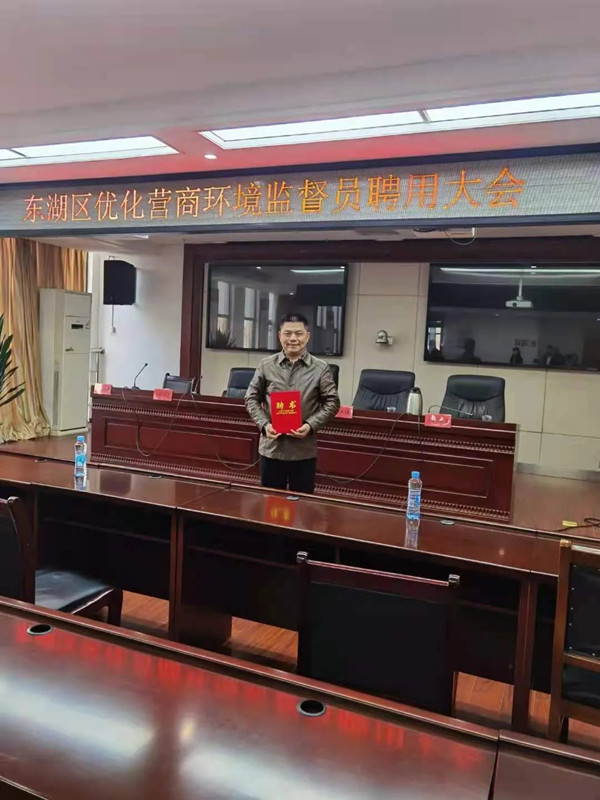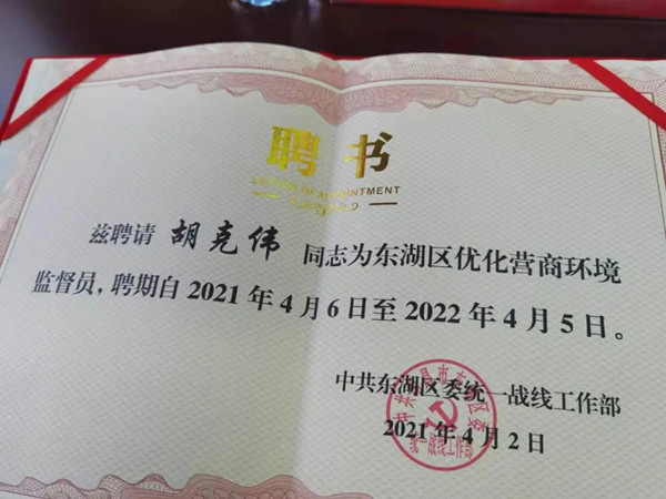 胡克伟说,作为优化营商环境监督员,会保证营商环境的健康发展,当好人民监督员,本着对政府负责,对人民负责的精神,履好职,尽好责,带领鸿基装饰集团推动东湖民营经济高质量发展,描绘好新时代江西改革发展新画卷而努力。