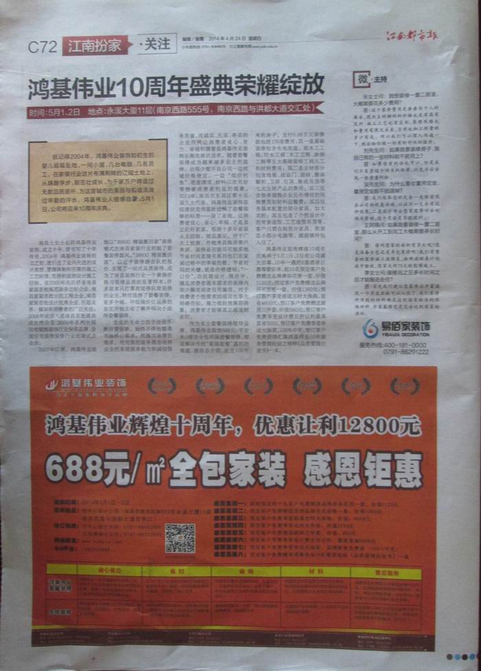 南昌全包装修鸿基伟业装饰辉煌10周年庆典将于5月1日、2日在公司盛大启幕。10年一遇的8重感恩巨惠等着你来。前10名预定客户免费赠送品牌淋浴花洒一套,价值1120元;预定客户免费赠送品牌开关面板一套,价值1360元;预订客户享受超值主材大换购,直省4600元;预订客户免费赠送厨房三件套,价值680元;预订客户免费享受设计费五折让利最高直省5000,预订客户免费享受幸运大抽奖,100%中奖;预订客户免费获得汇集鸿基伟业10年服务管理经验之精粹《品质管理白皮书》一本。