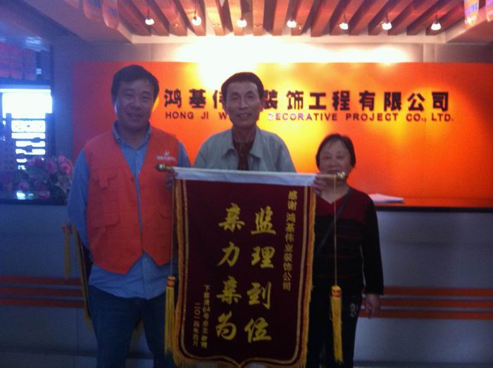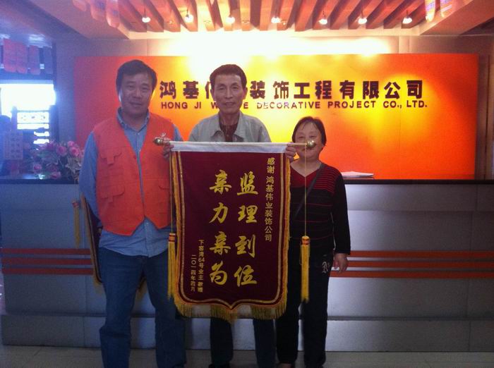 2014年5月9日下午,下罗湾64号业主龚女士专程来到南昌鸿基伟业装饰,将一面绣有“监理到位,亲力亲为;的大红锦旗送到鸿基伟业公司领导手中,衷心感谢项目经理魏建保在为她新房装修时尽心尽力的服务态度和优秀的施工质量。