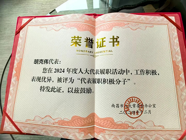 自担任市人大代表以来,胡克伟始终以高度的责任感与使命感投身于人大代表工作,深入基层调研,倾听民众心声,积极参与各类会议和活动,展现出了极高的工作热情与专业素养。胡克伟说:“此次获得这两项荣誉,既是对过往人大履职工作的认可,更是一份沉甸甸的责任与鞭策。在未来的人大履职工作过程中,会继续秉持初心,扎根基层,深入挖掘人民群众在各个生活领域面临的实际困难。力求提出更多兼具深度与可操作性的建议,为南昌高质量发展添砖加瓦,贡献人大代表的力量!”