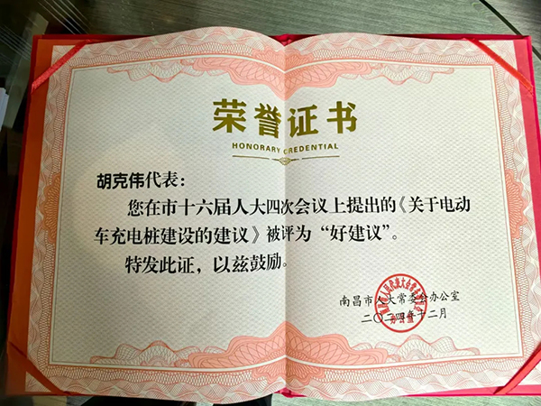 因工作积极,表现优异,胡克伟获得2024年度“代表履职积极分子”荣誉表彰。提出的«关于电动车充电桩建设的建议»给出了一系列切实可行的实施举措。该建议经过层层筛选与严格评审,最终被评为“好建议”。