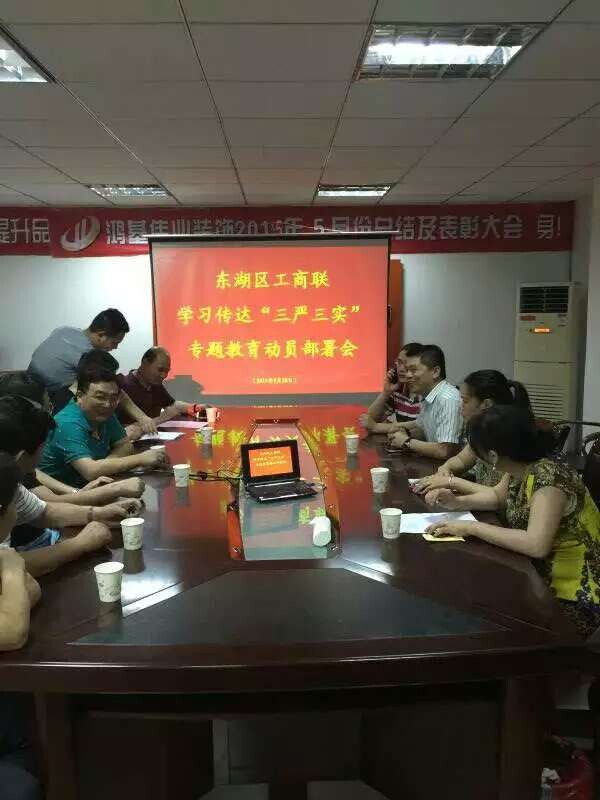 南昌市东湖区工商联学习传达"三严三实"专题教肓动员布署会今天在公司总部会议室召开,参加此次教育动员布署会议人员有,东湖区工商联胡主席以及工商联各行业企业代表、共16人参加此次会议。会上南昌市东湖区第十五届人大代表、鸿基伟业装饰总经理胡总发表感言,表示鸿基伟业装饰公司全体人员将以此会契机,严以修身、严以律己、严以执行,低调做人、高调做事、脚踏实地,为2017年全面实现地级市分公司布局而奋斗!