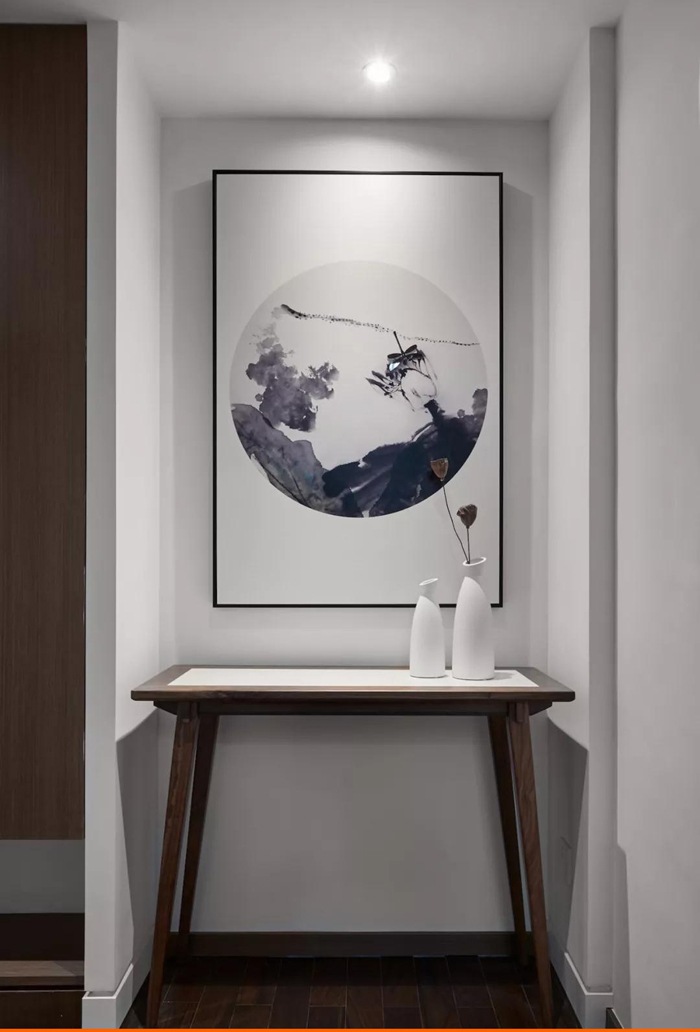 ▲ 建筑面积140平, 入户中式风水墨画搭配木质案几,摆放瓷白花瓶,流露意洁高雅的门厅