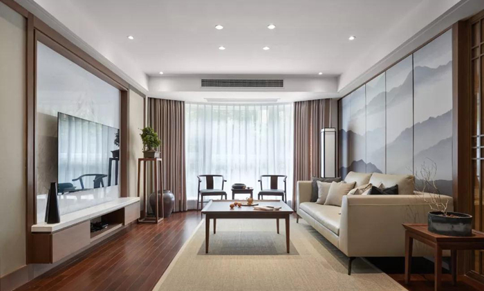 ▲ 客厅地面通铺木地板搭配无主灯顶面,呼应窗户作弧度吊顶并安装中央空调