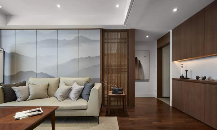 ▲ 采用壁画硬包加木质格栅作沙发背景墙,若影若现,充满意境