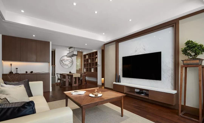 ▲ 大理石的自然纹理与沙发背景壁画呼应,独一无二,木作边框连接架空电视柜,质感细腻,功能实用