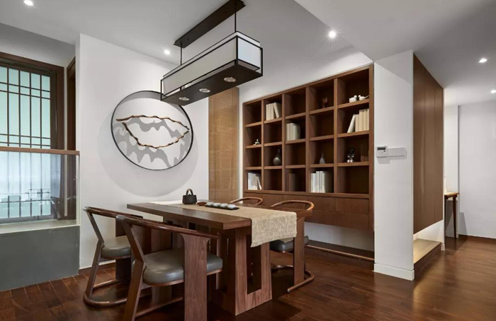 ▲ 中式风餐桌椅搭配吊灯与立体感墙饰,充满意境