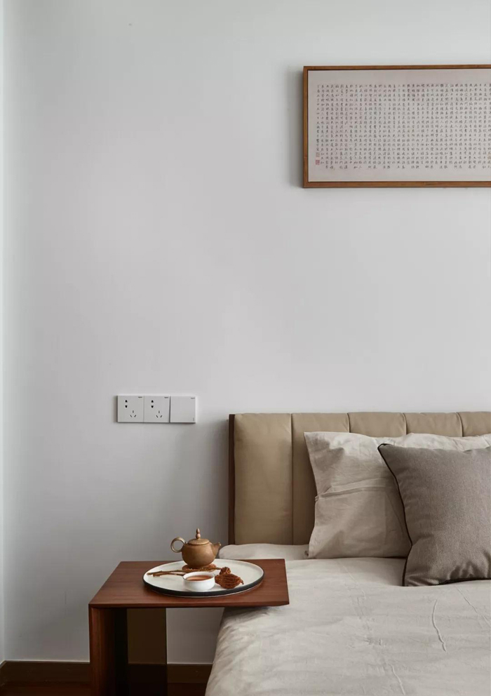 ▲ 次卧干净简洁的白色空间点缀一幅字画作背景,整体色调与布置典雅又不失时尚
