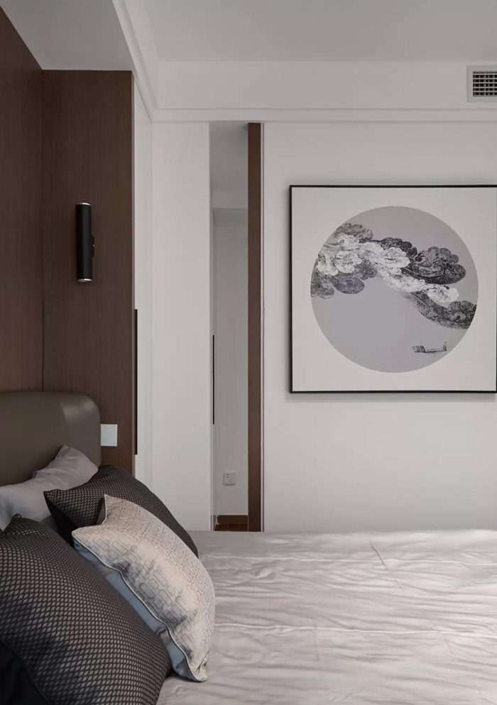 ▲ 睡眠区整体以白色与木色结合,整面胡桃木饰面床背景,侧墙水墨装饰画整体空间亮点