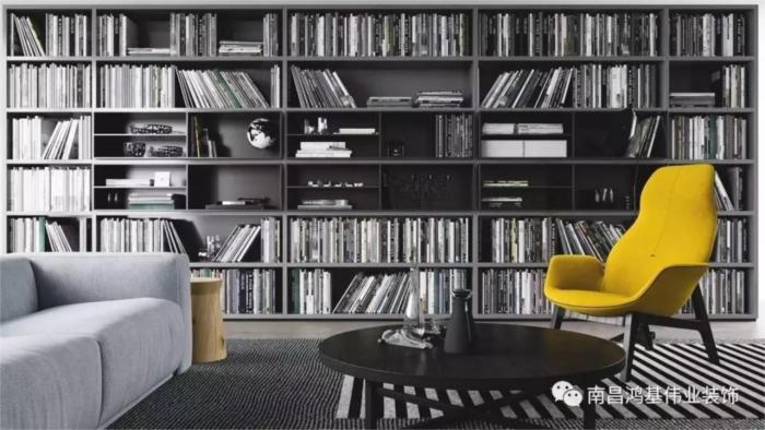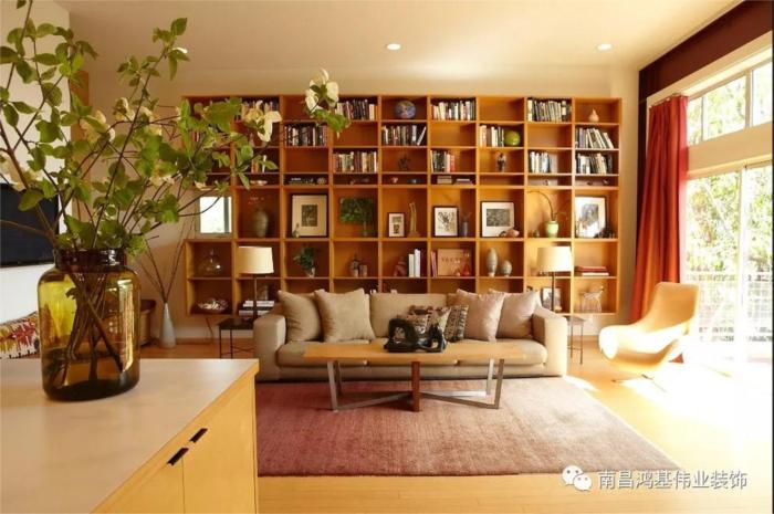 从现代居家环境的结构来讲,如果想完成大规模的藏书。最有效的办法就是在客厅中制作书架墙。想实现这个愿望也不难。只需有效地利用电视背景和沙发背景,设置一个有型有款的书架墙,再加一个舒适的沙发,就足够了。