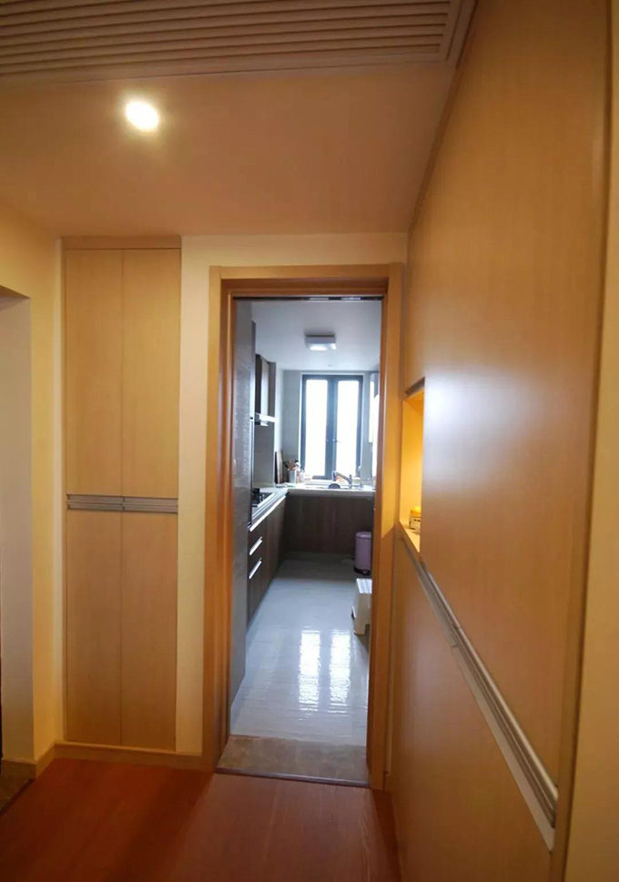 进门左手边的位置设计师做了一个小型收纳柜,一进门可以把脱下来的外套、帽子、围巾等挂在里面,封闭的空间不容易落灰,也非常好清理。