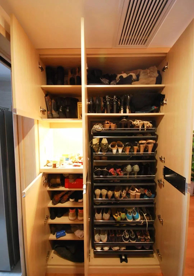 进门正对面处是鞋柜,收纳功能和质量非常好。将每层格挡的倾斜角度都错开,而且鞋架还可以拉开、收缩,利用有限的空间,折叠、穿插放鞋,是节省空间的好物。看这满满当当的鞋,至少也有三四十双了。