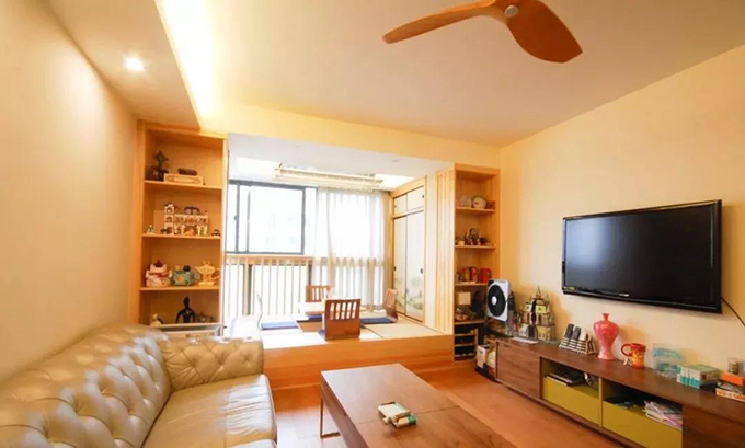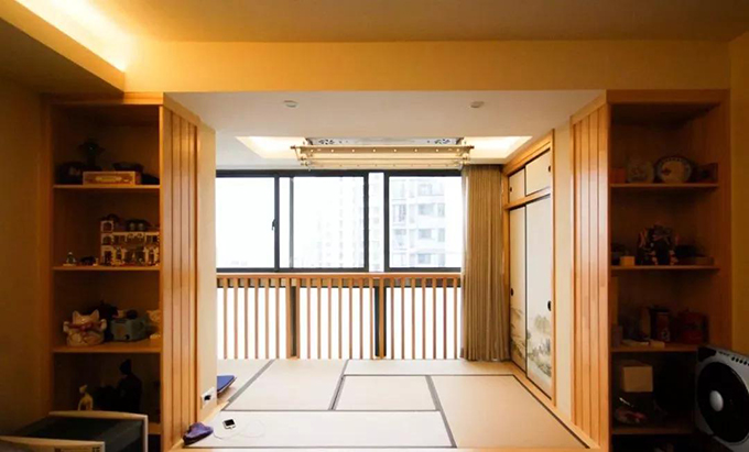 考虑整体的收纳空间要够,所以设计师把阳台的空间也利用起来,做成了日式风格的榻榻米。屏风式的推拉门节省了空间,也有收纳的功能。将物品隐藏在后面,整体淡雅有禅意。