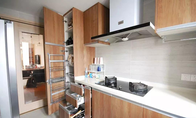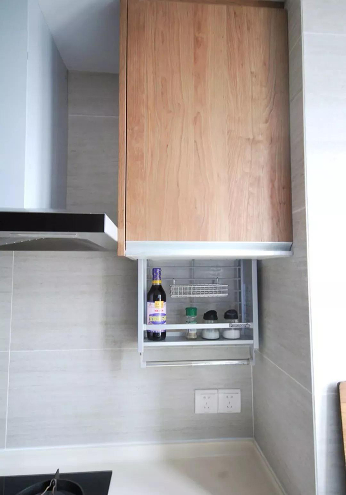 定制的家具有一点非常好的是可以根据业主的使用习惯制作,比如马先生家做饭调料习惯放右边,那就在右手边的位置做一个带拉杆的调料收纳篮,水槽边就是沥水碗柜,洗过的碗筷顺手就可以放进去。