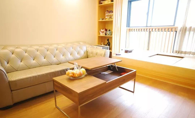 日式榻榻米中间还有一个升降桌,升起桌子,摆好座椅,放上茶盘,就是一块享受宁静的禅意空间。把桌子降下去,坐在榻榻米上晒太阳,颇有“岁月静好”的感受。