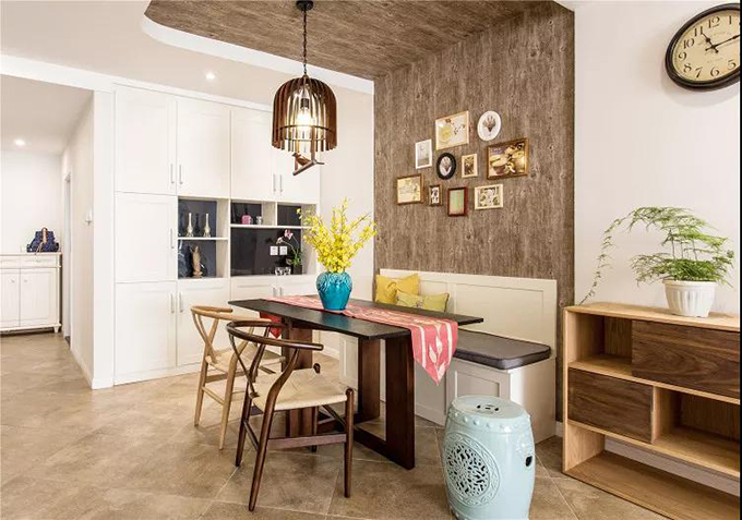 ▲下面是简约自然的餐桌,背后是充满生活气息的照片墙