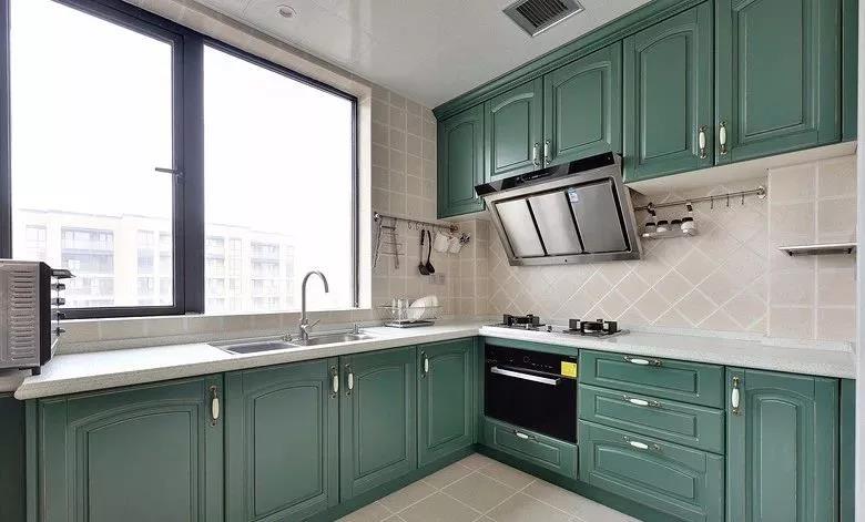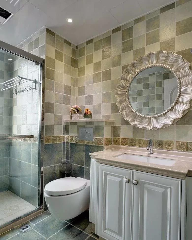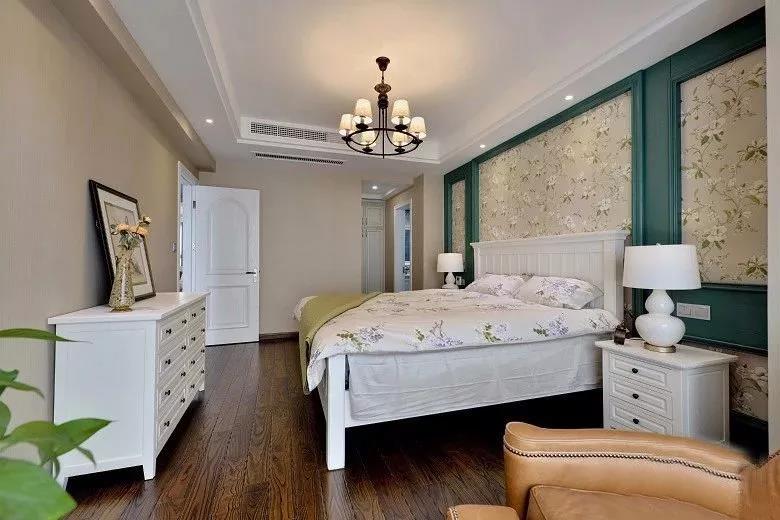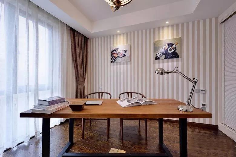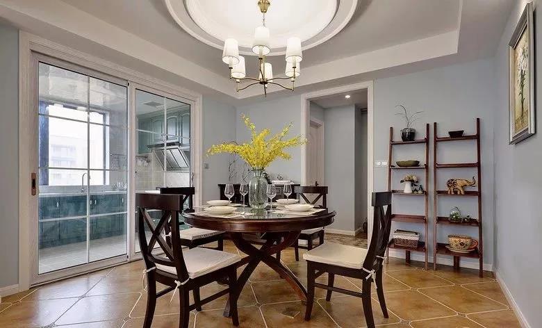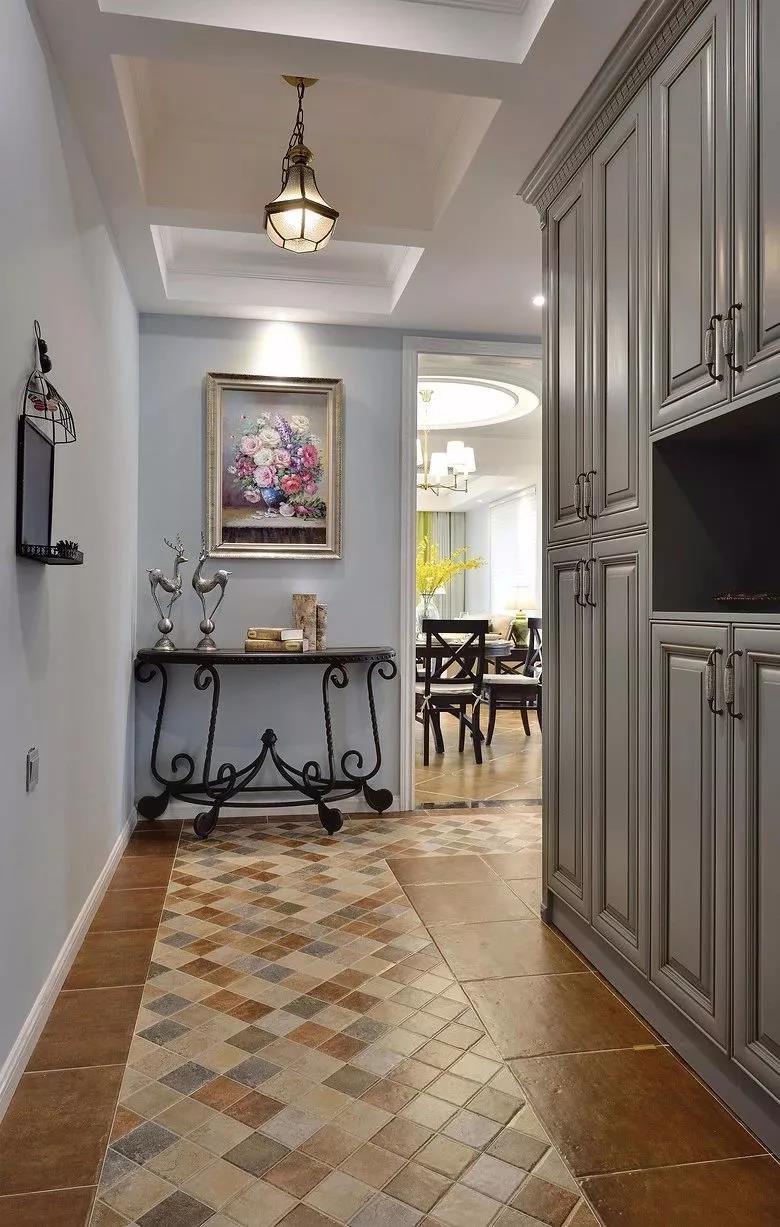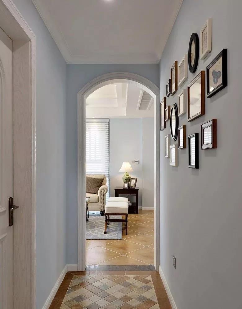 今天分享的是一套150平米的房子,整体装修以现代美式风格为主,在优雅精致的仿古质感下,搭配上淡雅的色调,精致的软装,装出一个独特的华丽端庄之家。 进入玄关区域,迎面而来的是棕色仿古砖作为边线,中间贴上仿古质感的马赛克地砖,在拐角墙面摆上一个铁艺端景台,摆饰上小饰品,墙面挂上一副油画,让你一进门就感受到不一样的精致文艺气息。侧边油灰色的鞋柜收纳柜,搭配灰色的墙面,为这个空间带来了几分安静的气息。 客厅 客厅两面临窗,具有更加明亮的空间感,沙发靠窗摆放,这面窗以百叶帘作为窗帘,淡蓝色的墙面搭配井格造型的天花,搭配上美式格调的家居软装,显得格外的优雅高档。 精致的台灯。 餐厅 餐厅面积相对宽松,摆上一套圆形的餐桌椅,结合圆形的吊灯造型,显得和谐端庄而大气。旁边的墙面上架着2个小收纳架,摆着精致优雅的饰品,让餐厅显得更加端庄雅致。 厨房 厨房的橱柜以青绿色的橱柜,有着大面积的窗户,让厨房显得格外的舒适明亮,在这个宽敞的厨房里做饭,相信心情都能舒畅不少。 走廊 走廊与客厅隔着一个拱形门,采用与玄关一致的仿古马赛克地砖,淡蓝色的墙面上挂上一组的照片墙,让空间更加的优雅精致大气。 卧室 床头背景墙以蓝绿色的边框搭配上花纹壁纸,木地板基础摆上一张白色的床与床头柜,搭配深蓝色的窗帘,整个空间充满了儒雅高档的空间感。 床尾上摆一只白色抽屉斗柜,台面上一幅花鸟装饰画,还有一瓶小插画。 衣帽间 衣帽间以开放式的衣柜,木质感的衣柜中间还嵌入了一张小梳妆台,女主人可以在这里化妆穿着打扮一番。 次卧 次卧床头在壁纸的基础,四周做了简单的吊顶,深色木地板搭配上一张棕色皮艺靠背的床垫,一张舒适的床单,提供了个安静闲适的休憩空间。 书房 书房以竖纹壁纸张贴墙面,一张大大的双人书桌,为主人提供了个宽松的在家看书工作的空间。 卫生间 卫生间墙脚以仿古蓝墙面,中间贴着花纹腰线,墙身则是白+褐的仿古砖,白色洗手盆搭配一只太阳造型的镜子,显得格外的端庄雅致。