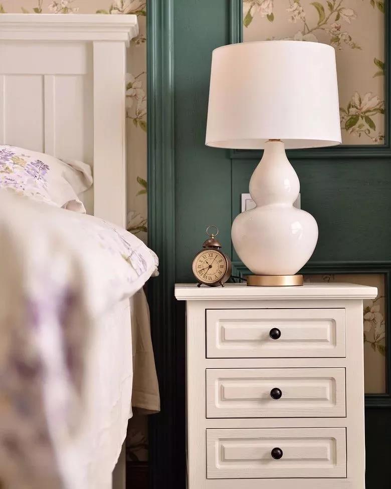 床头旁边的抽屉床头柜,还有一只葫芦造型的台灯,一只复古闹钟,精致的细节让房子充满了优雅的气息。