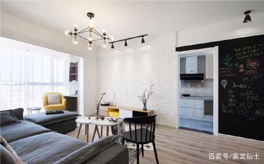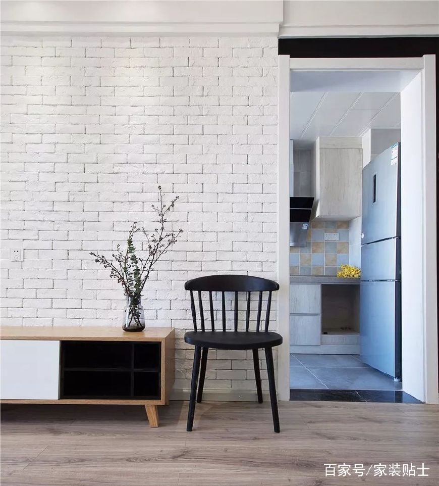 ▲ 电视墙的右边进去是厨房,为了让空间看起来更加美观与实用,在厨房门的旁边刷了黑板漆,使空间简约而不简单,还可记录生活的点点滴滴。