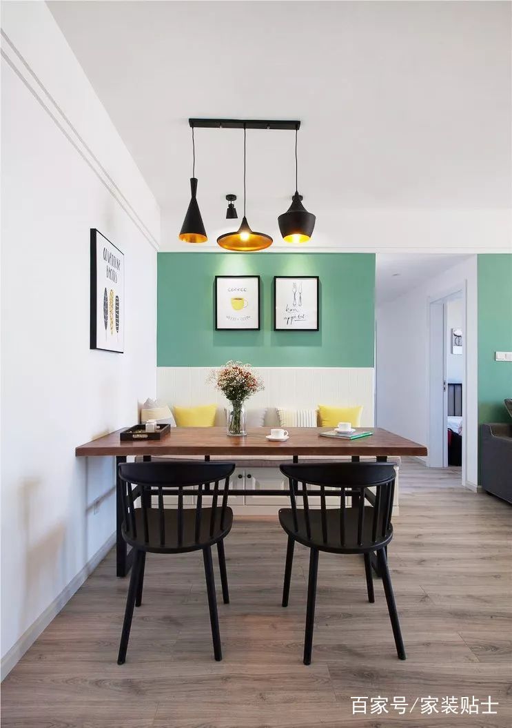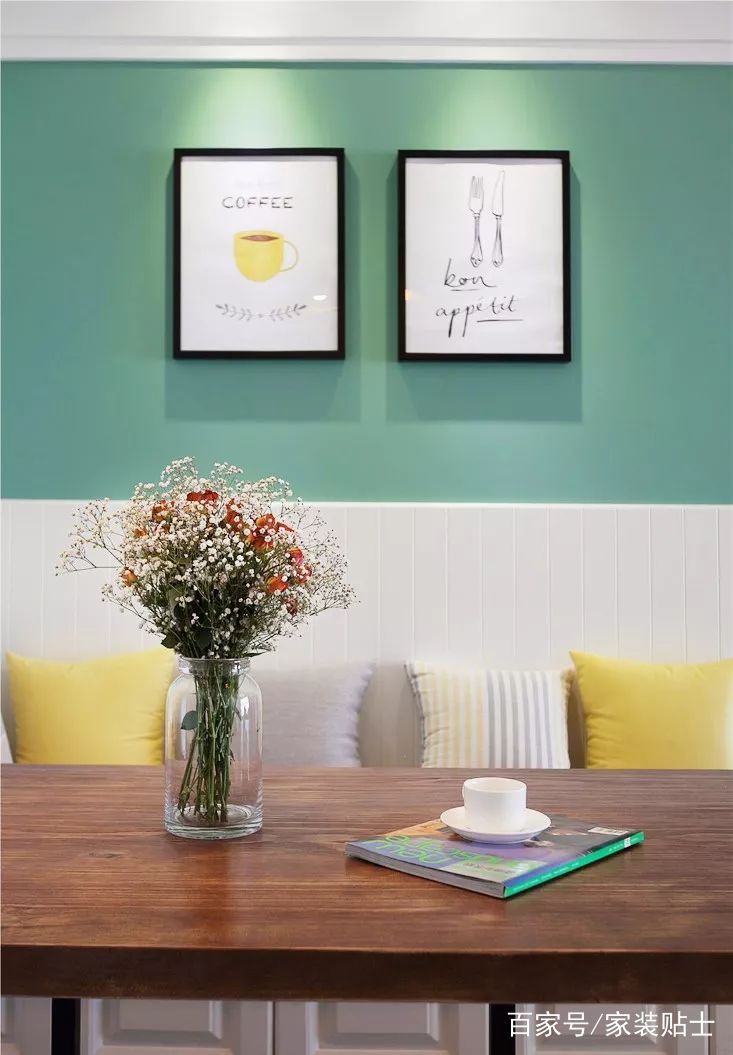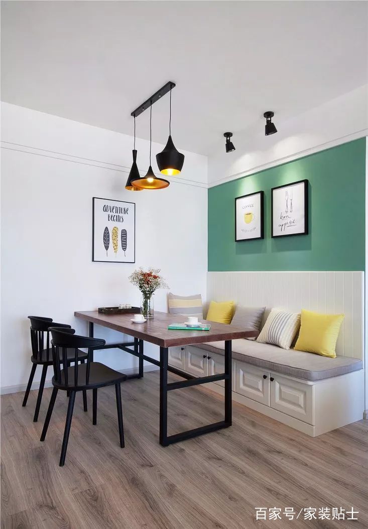 ▲ 餐厅利用卡座的形式,增加了储物的功能。墙面颜色选择和沙发背景墙颜色一样,增加空间的连贯性。