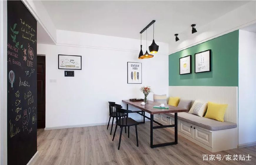 ▲ 黑板墙转角是入户门,简单的百叶门鞋柜和挂画搭配。