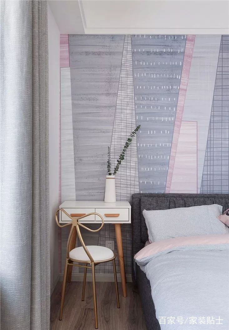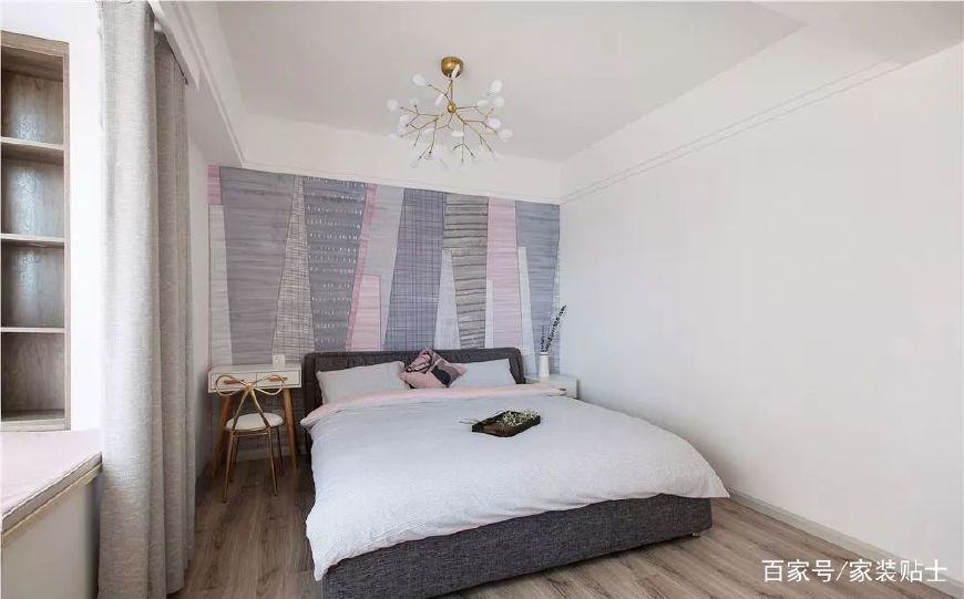 ▲ 主卧是由两个房间打通设计而成的,增加了衣帽间的功能,以白、灰、粉为主色调,大气自然,宽敞舒适