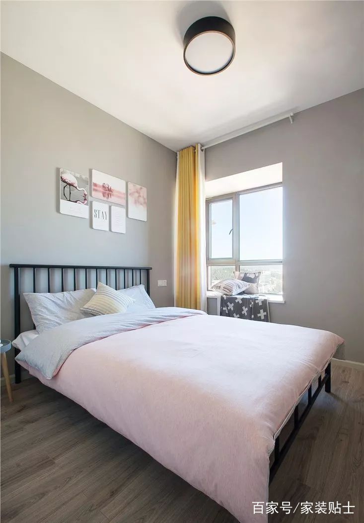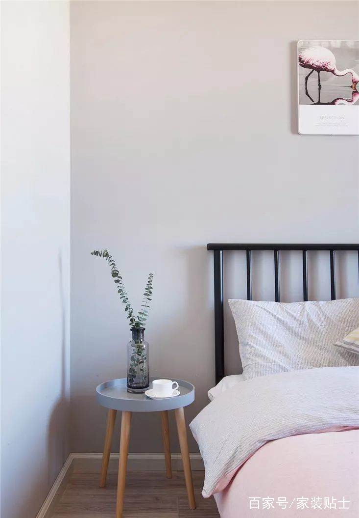 ▲ 次卧与主卧的风格相得益彰,灰色的墙面加黑色的铁艺床,粉色的装饰画与床品,恬静温馨。