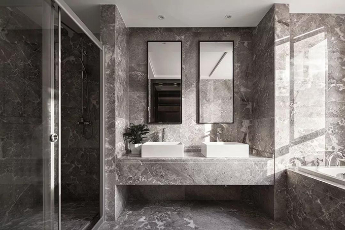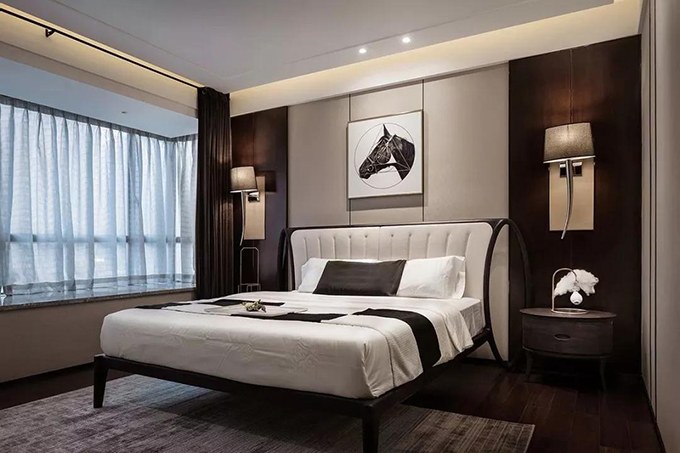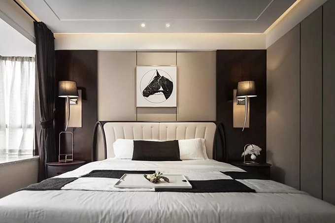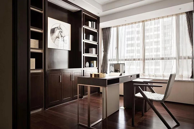 ▲客厅是舒缓低调的色彩搭配,摆上柔和的布艺沙发,配合一些黑白细节的点缀,置身其中能感受到无尽的舒适 ▲沙发墙两边是木质镂空的隔断式过渡,营造了不少通透大方的典雅意味。 ▲深木色的哑口、门套框架配合白墙,营造了深邃平和的感觉。 主卧 ▲卧室是黑白的色调,对称的布局,配合吊顶的藏光,充满格调之余也很精致耐看。 ▲床头灯的位置以木饰面进行强调,显得温和儒雅。 书房 ▲几何造型的书桌和书桌椅,充满着简练的现代美感。整墙的书柜,中间挂上一幅马首装饰画,给书房融入了不少自由惬意。 休闲区 ▲对称的布局,更显肃穆端庄的韵味。墙面的圆镜两侧是两个嵌入式的展示柜,方圆的结合极具东方色彩。 ▲两侧的落地窗搭配百叶帘,大显清新通透感。结合一把树枝造型椅和一盏树干摆件上的田园灯,满满的自在轻松。 卫生间 ▲与主卧以玻璃门相隔,墙面和地面都是灰调的大理石瓷砖,搭配双人位的洗漱空间,阳光洒入,高级感也紧跟着出来了。
