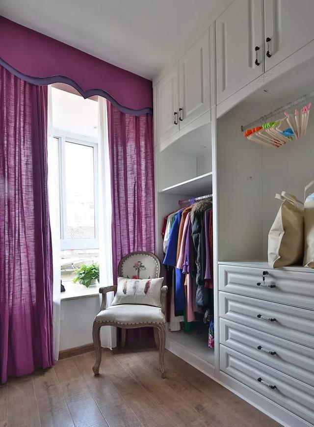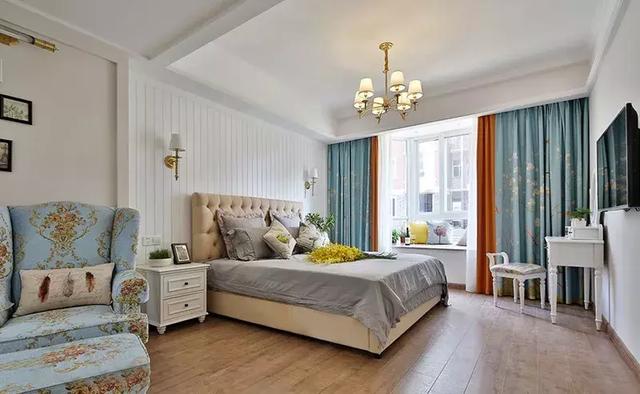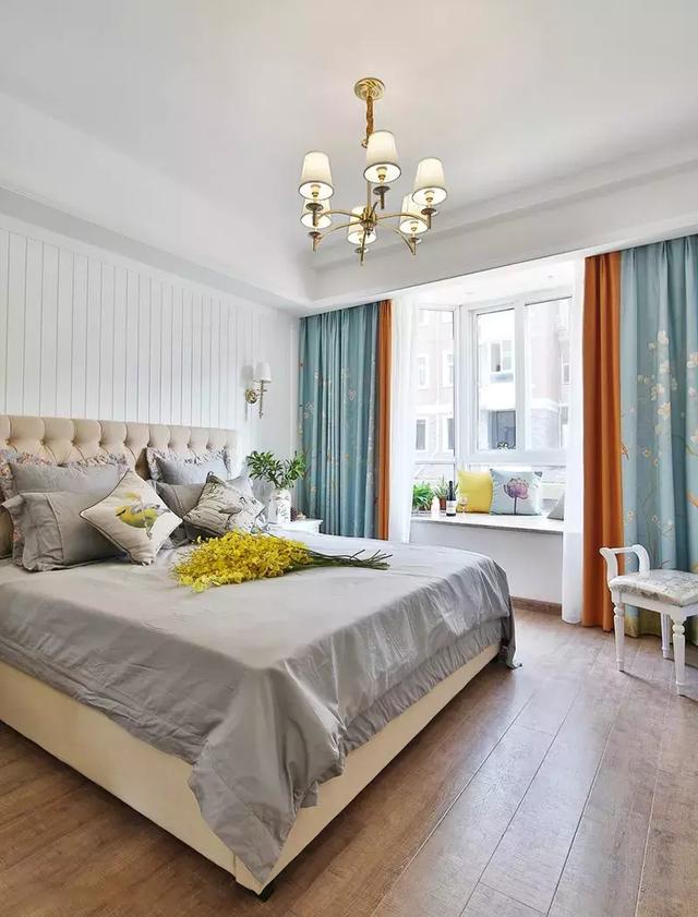 撞色的窗帘原木色的地板把原本就温润的空间打造的更加的浪漫温馨