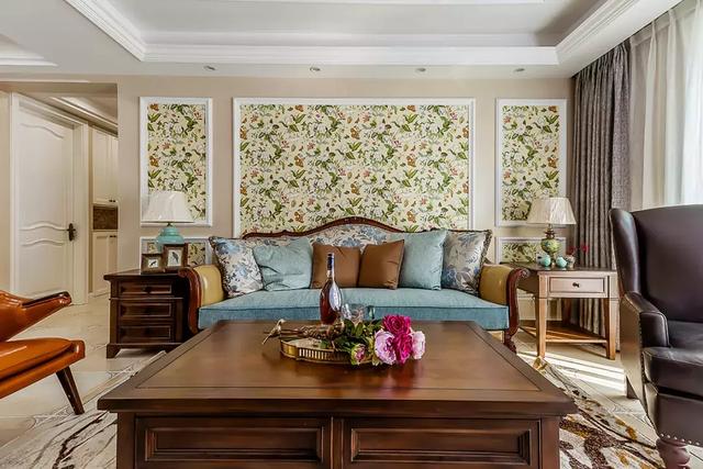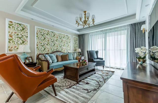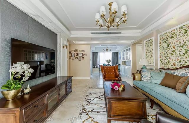 ▲客厅天花做了简约的跌级吊顶,地面则延续了玄关的复古地砖,而浅黄色沙发墙的边线造型划分出碎花壁纸的空间,给人低调优雅的氛围感。