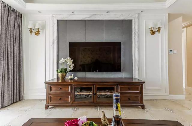 ▲白色大理石砌出了灰色纹理壁纸的空间,而两边石膏造型则加以壁灯点缀,配合深木色电视柜,突显端庄质感。