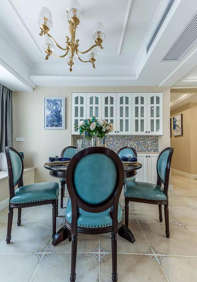 ▲深木色餐桌搭配铜绿色餐桌椅,结合桌上精致的餐具和鲜花,打造出恬美怡人的就餐氛围。