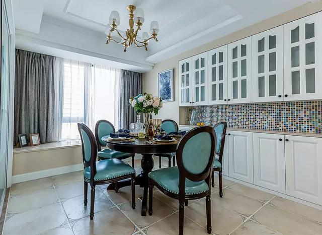 ▲右侧玻璃柜门吊柜+白色地柜的餐边柜,中部留空层的墙面贴了马赛克砖,特别有田园风味。