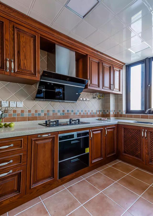 ▲棕色为主色调的厨房,墙面以丰富的砖色过渡营造层次感,破开了实木橱柜的沉稳感,达到视觉的平衡。