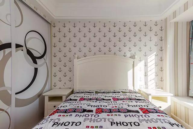 ▲次卧床头贴船锚壁纸,推拉衣柜门上,也有着独特的图案,显得充满设计感。