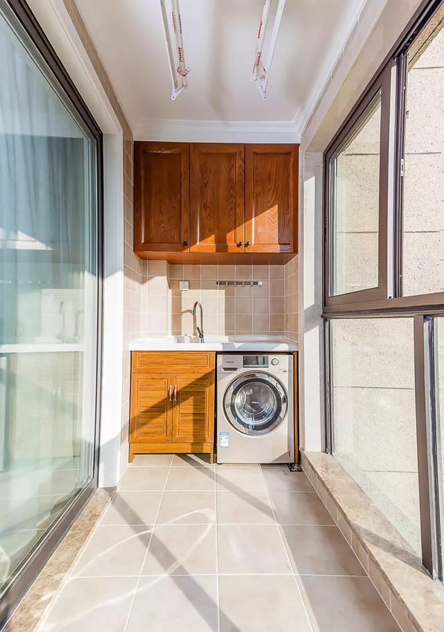 ▲契合墙面做了实木吊柜和地柜,而洗衣机是嵌入式布置,显得实用大方很精致。