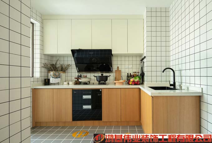 厨房以暖系白色为主色,搭配了原木色的橱柜设计,吊柜+地柜组合,收纳性扩大不止一倍。白色的墙砖,显得厨房干净简洁,加上窗户采光性好,让整个厨房光线明亮,营造一个舒适时尚的烹饪空间。