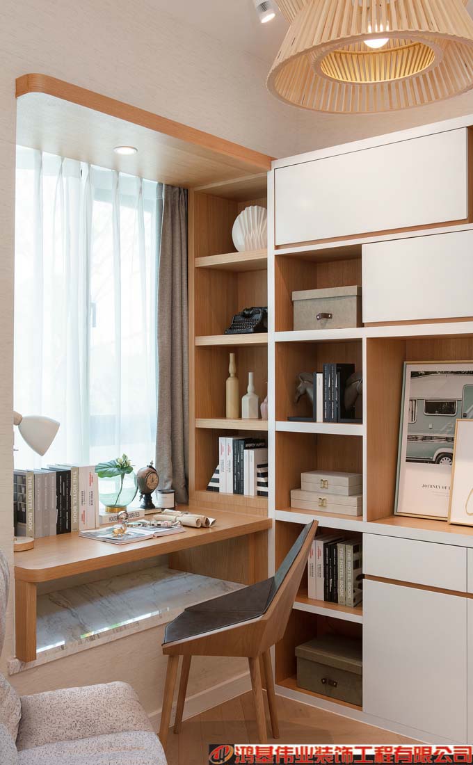 书房视野开阔,白色墙面柜体搭配原木家具、地板,显得格外的自然协调,书桌与书柜一体化,扩大了收藏空间。清新自然的北欧风,总能带给人们以舒适娴静,我们希望给人带来如沐春风般的感觉。