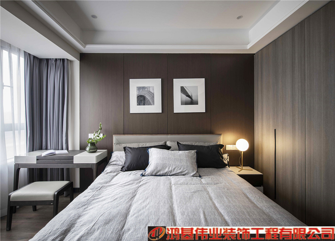 -主卧-整个空间格局合理紧凑又不失简洁,抛开一切华而不实的装饰,使用深色木质面和暖色光源,将这里营造成一个十分舒适的睡眠空间。