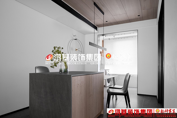 图3.4.亮点:餐厅以独特的条形吊灯和挂钟来烘托空间氛围,使用餐桌+岛台一起设计,这样不仅可以扩展操作台充当餐桌辅助,也可以作为作为阅读办公区域使用。厨房以实用为先,使用了常用的“L”型布局,充分利用拐角地带,实现空间利用率的最大化。